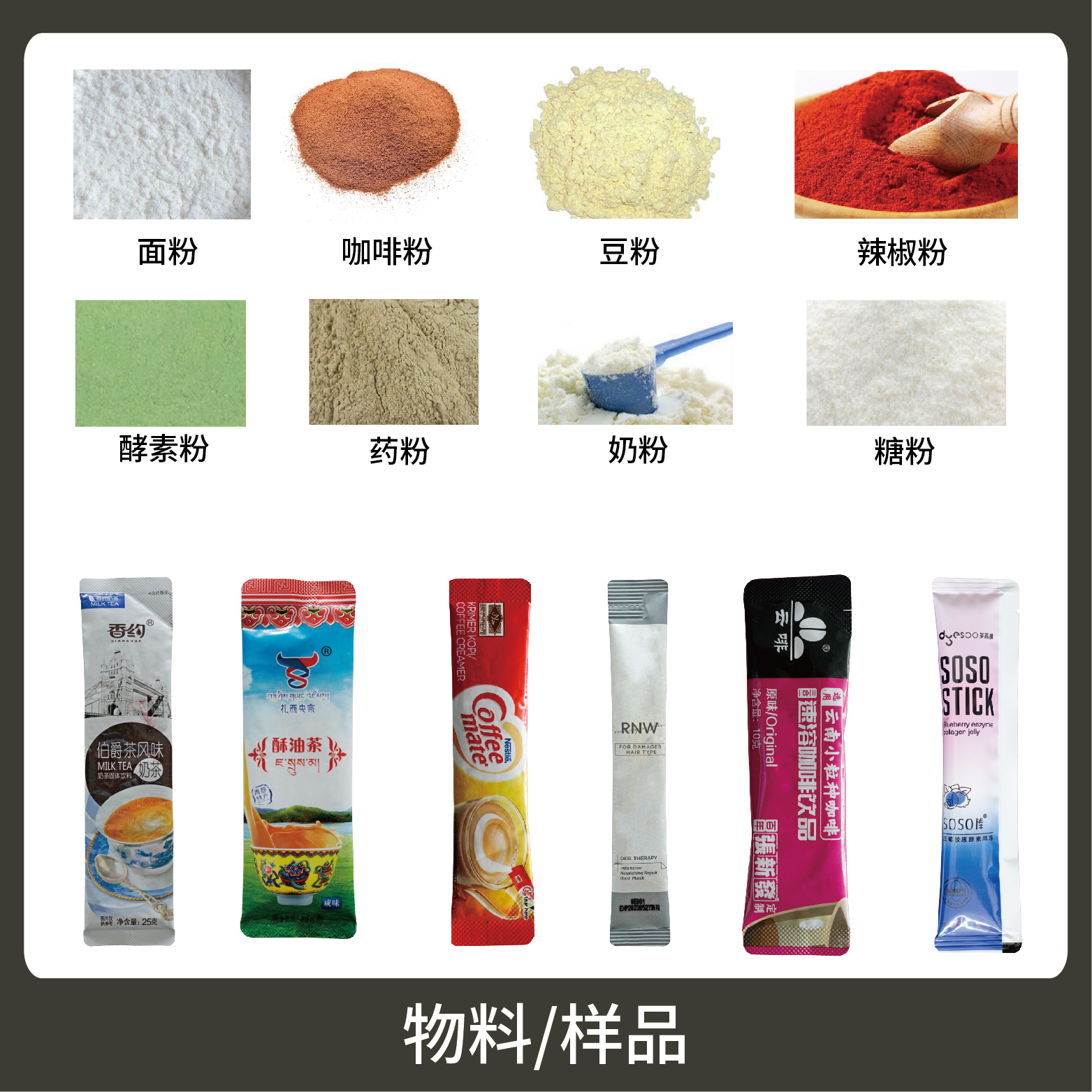 適用于食品、醫(yī)藥、化工、化妝品行業(yè)中粉劑等物品的計量包裝,如:奶粉、蛋白質(zhì)粉、咖啡粉、藥粉等。
